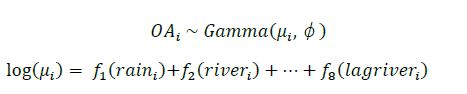 | GAM1 | Lagged count***, day of year***, wind direction*, lag river | 0.53 | 1930 | 1819 |