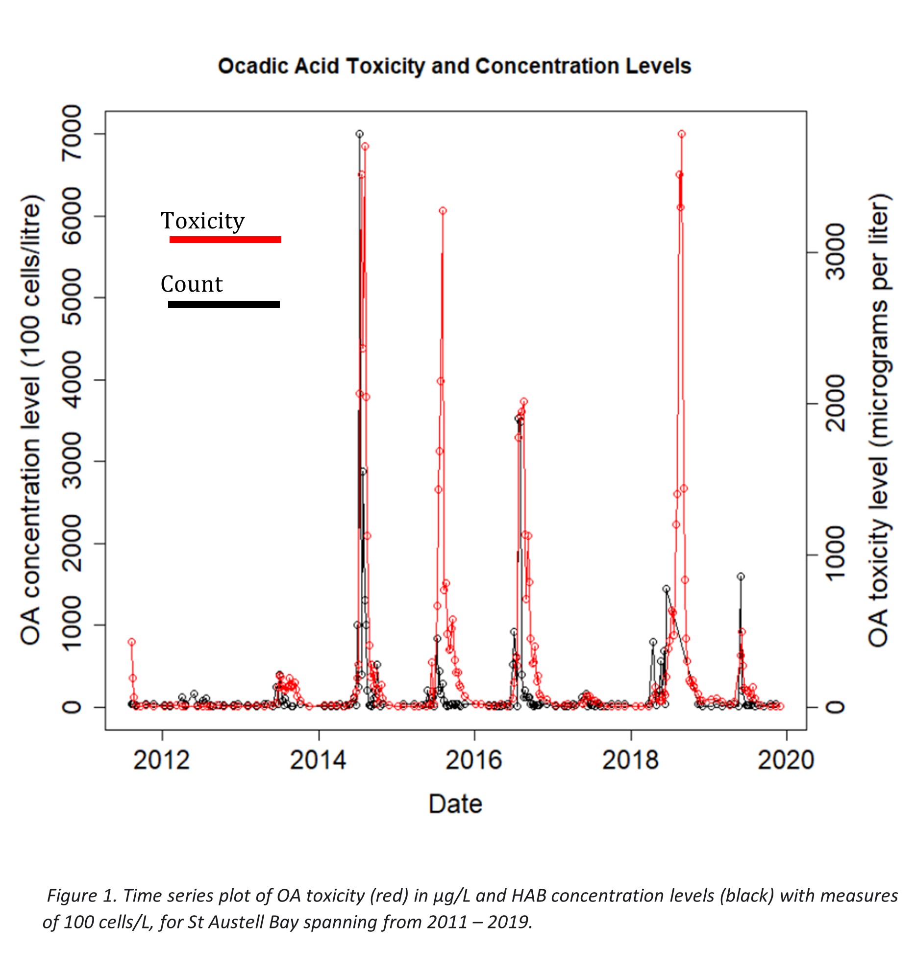 There have been previous efforts to study environmental conditions such as rainfall and windspeeds, that correlate to high levels of HAB toxicity, however short-term forecasting models for prediction of HAB toxicity in South West England region have not been widespread. Methods looking into HAB cell concentration and the seasonal components have yet to be extensively used for HAB forecasting. Here the project will identify key drivers for elevated OA toxicity levels and explore the use of HAB cell concentration and in addition investigate the time series of OA toxicity levels. With this information forecasting models were developed with two different approaches that can be used to deliver data driven decisions.