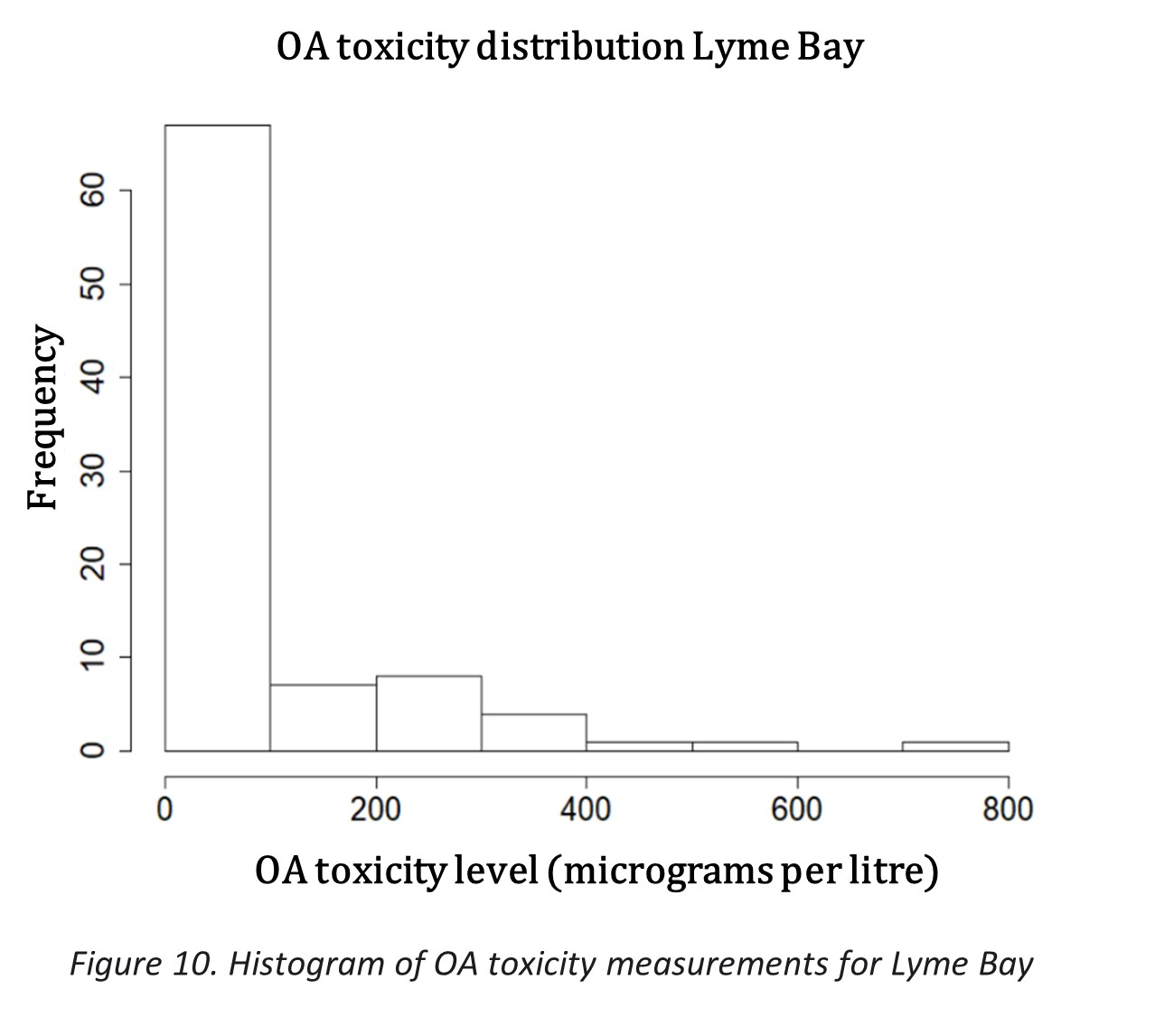 The histograms in figures 9 and 10 show the distribution of OA toxicity for both Bays. Both distributions are similar to that of St Austell Bay; however, Lyme Bay does not have such extreme values as St Austell and Lantivet Bays, with a maximum OA toxicity level of 800 compared to 4000 at Lantivet Bay and 7000 at St Austell Bay. Lyme Bay also has substantially less measurements that cross the threshold level of 160 mg/L, with overall less varied measurements.