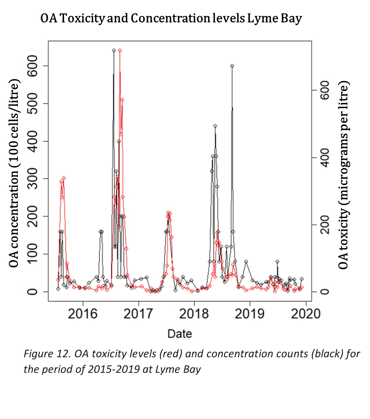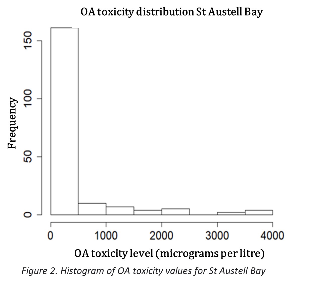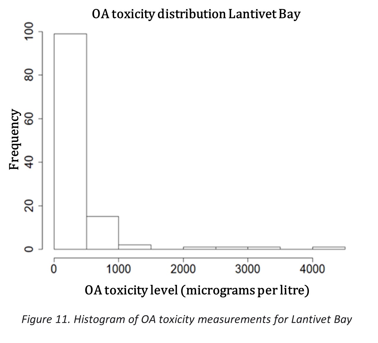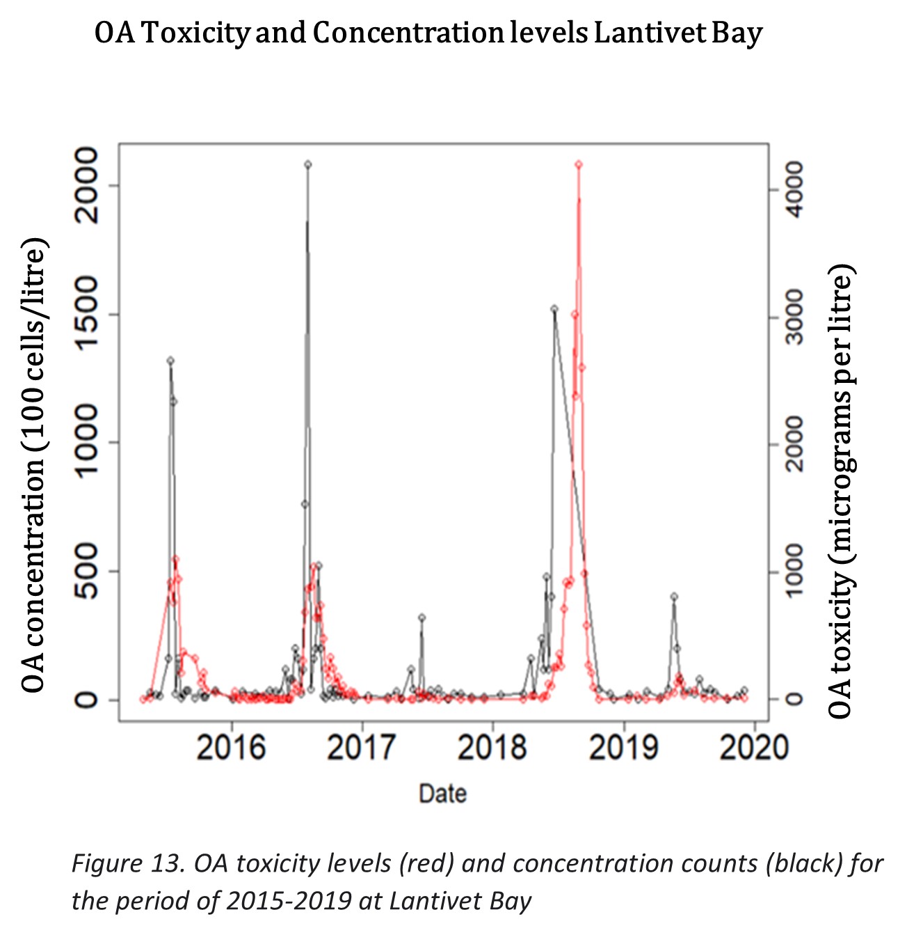 The following figures 12 and 13 show the time series of the OA toxicity at each bay site, with the corresponding concentration levels. These figures show similar patterns to St Austell Bays time series, with the presence of a seasonal cycle with high toxicity in warmer months. However, the relationship between HAB cell count and toxicity levels for both bays differ from that of St Austell, in a way that indicates less lagged correlation, but still a strong relationship between the two.