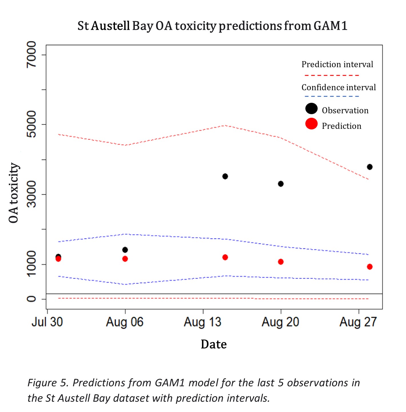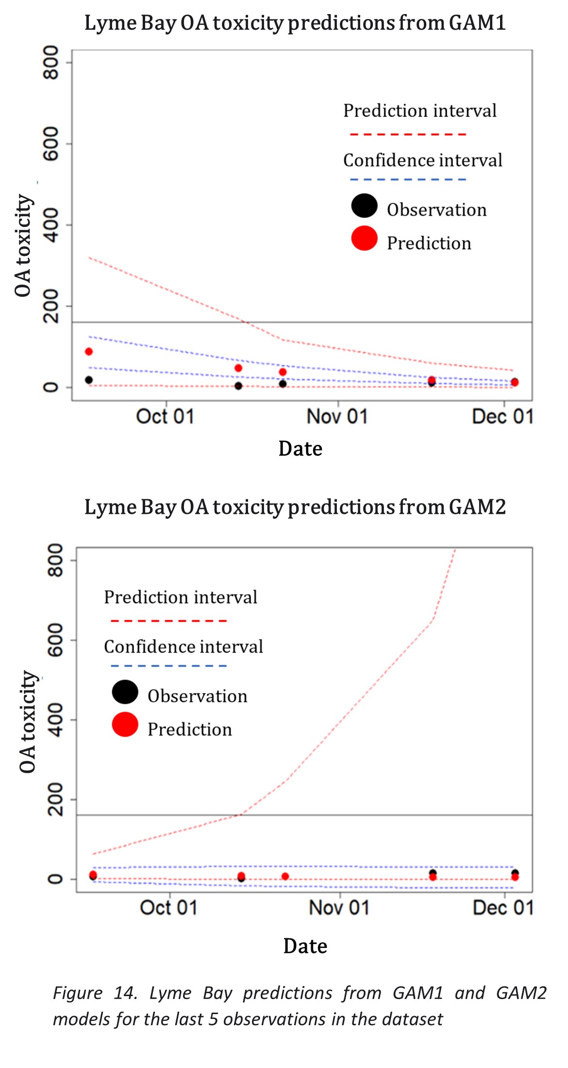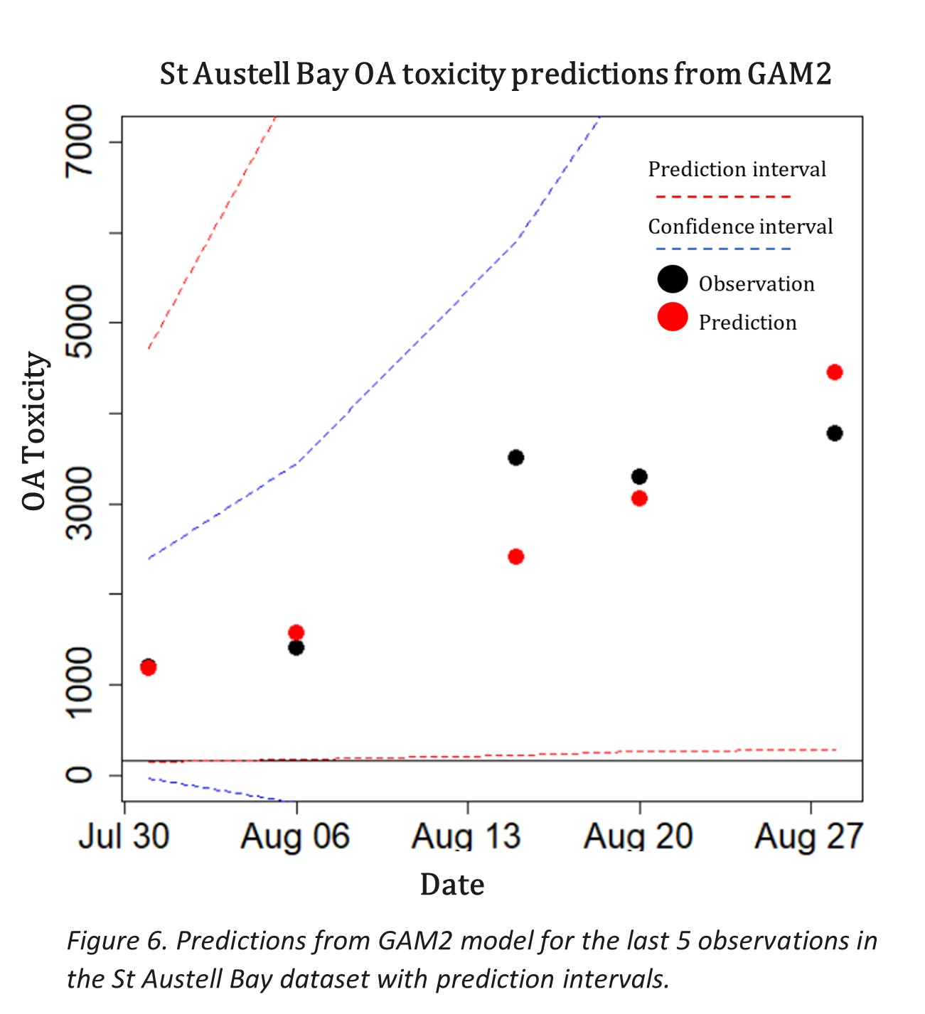 The statistical methods used in this project have shown that they are capable of producing short term forecasting solutions for the three investigated harvesting bays. And potentially adapted to more coastal locations across the South West of England. The GAM framework has demonstrated its ease of use when applied to in regard to OA toxicity. The smooth functions of GAMs allow for flexibility and addition of seasonal cycles that will adapt to the data for each location and capture the historic patterns.The models do not require lots of complex input variables to produce feasible results and deliver similar outputs across all bays even with different time scales of OA measurements and location characteristics. Data sets with 84 observations and with 160 observations have shown to be adequate. Having a few years' worth of data that captures seasonal changes is sufficient. Also, the modelling approach does not require heavy fine-tuning to suit the requirements of individual locations. Main advantages of this modelling approach are the use of readily available data, where HAB cell count and OA toxicity measures alone are able to produce feasible results. The addition of environmental variables (satellite observations and meteorological nowcasts and forecasts), which are also readily available in most cases, decrease the uncertainty of predictions when forecasting absolute OA toxicity values. The addition of these meteorological variables (windspeed, lagged rain) was only tested on St Austell Bay, however the models for Lyme Bay and Lantivet Bay still produced feasible results (with the exception of Lantivet Bay GAM1 model).As opposed to process-based models, the statistical approaches used in this project are much lighter in terms of computational power and these models can be easily and quickly adapted for shellfish farm management. Although the predictions of the absolute values of OA were not perfect, they were close to the original observations, yielding 100% accuracy for the threshold breaches classification on the 5 last observation for all three bays. The overall classification accuracy for GAM1 was 78% and for GAM2 was 75% when tested on St Austell Bay, and similar results for Lyme and Lantivet Bays (table 19).