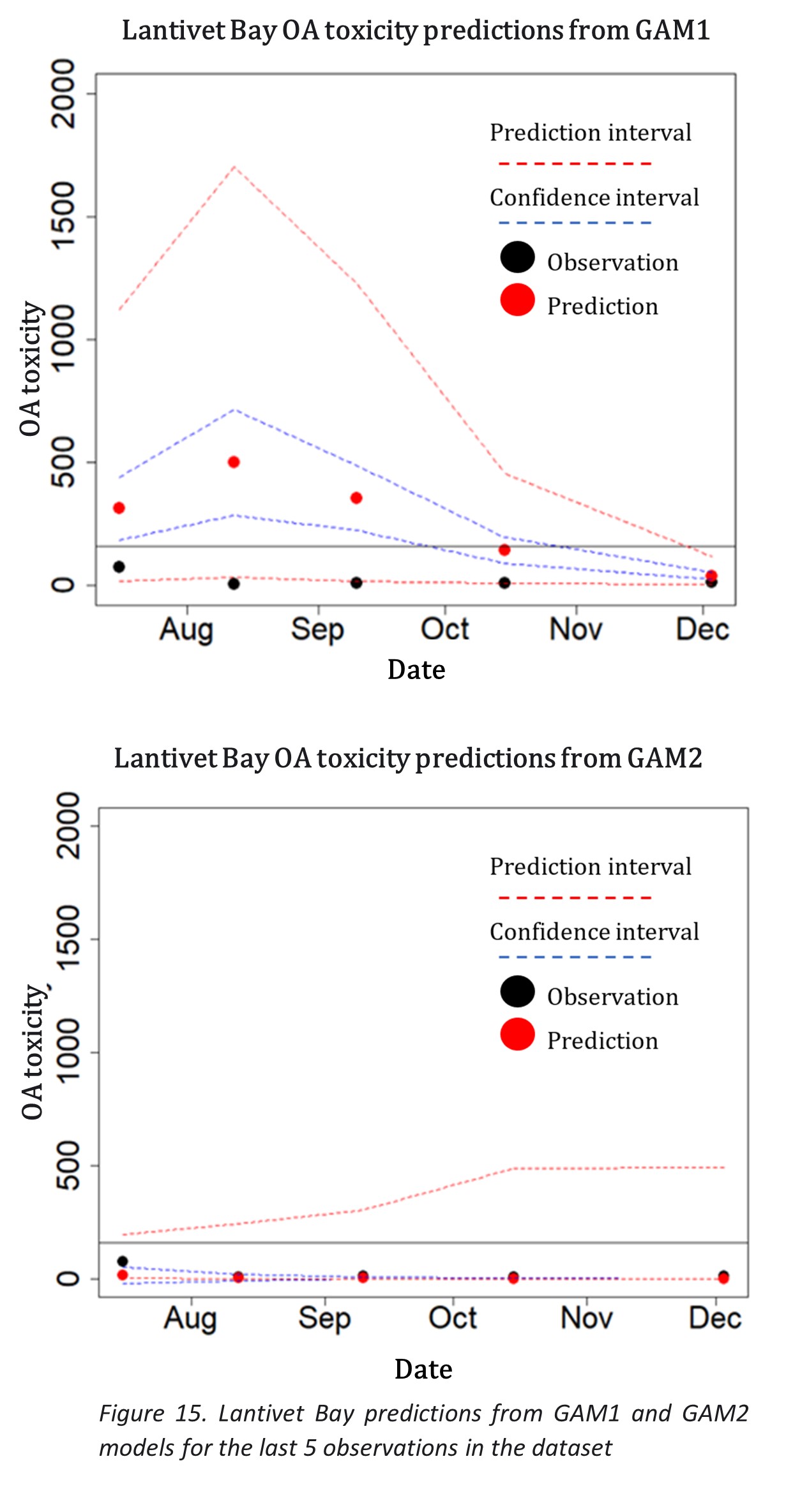In addition to developing GAM models with environmental variables, another aim of the project will be to investigate and model the time series of OA toxicity data for multiple sites. This approach would allow to utilise all the available information without losing any data points during synchronisation of data sets. Models based on time series of OA and the models with other environmental variables can then be combined to produce averaged short-term forecasting predictions.
