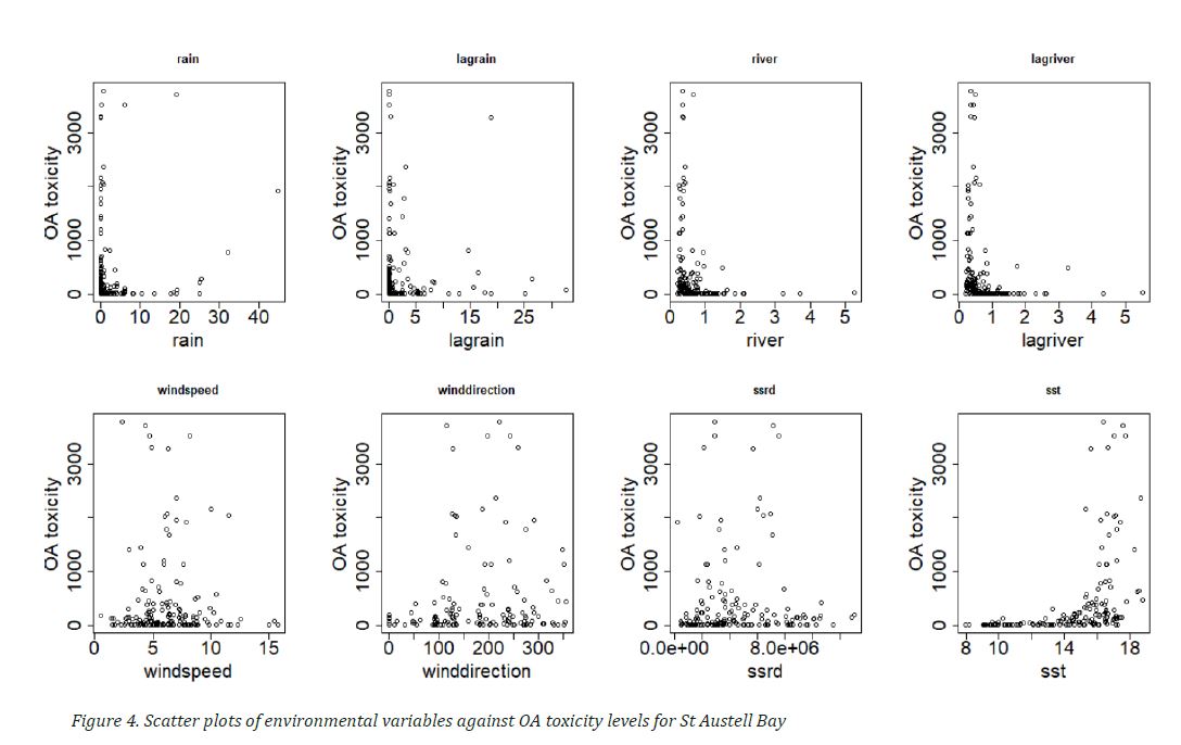 Firstly, the HAB concentration levels are to be explored to understand if the lags of this variable are significant for modelling use. Then a GAM model is to be developed based on the environmental drivers for St Austell Bay. This model will firstly predict the absolute values of OA toxicity, and then also predict the classification of threshold breaches, to determine if a farm is to be closed or for it to stay open (based on the breach of 160 μg/L of OA). This approach is then adapted for an additional two harvesting locations, Lyme and Lantivet Bay.